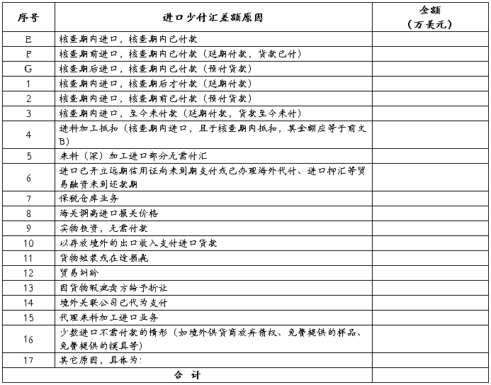 核查期内,我公司总量差额合计⑤ 万美元。其中:进口付汇差额⑥ 万美元,出口收汇差额⑦ 万美元,整体上呈现 (填写“进口少付汇、出口少收汇、进口多付汇、出口多收汇或转口贸易差额率偏高”中的某一项或几项)。总量差额偏离正常阈值的主要原因是