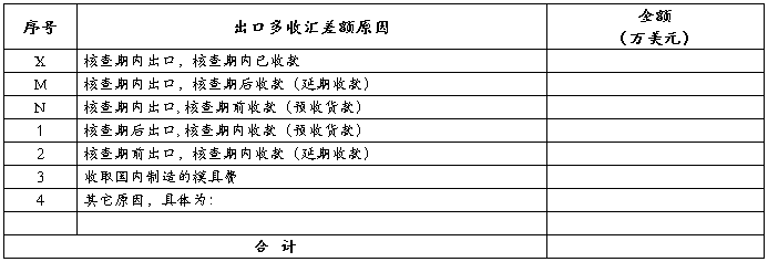 核查期内我公司出口 笔,出口金额④ 万美元,其中“来料加工”出口 万美元;收汇 笔,收汇金额③ 万美元。出口收汇差额⑦ 万美元(收汇-出口),表现为 (填写出口少收汇或出口多收汇),详见表3/表4(请选填)。